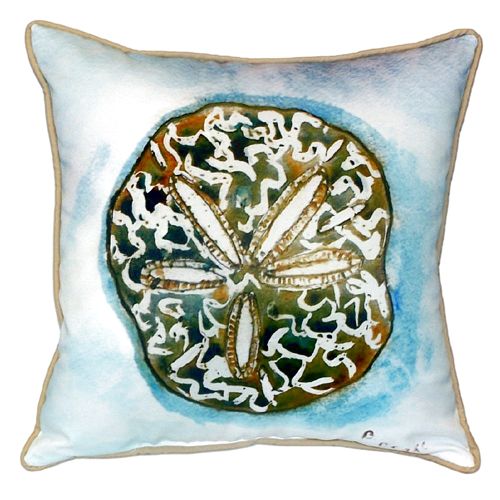 Betsy's Sand Dollar Small Indoor/Outdoor Pillow versatile pillows are equally at home enhancing an interior design or adding life to an outdoor setting. They feature printed outdoor, fade resistant fabric for years of wear and enjoyment. Artwork on one side. Measure 12"x12" or 11"x14" depending on shape. Machine Washable Artwork on one side.