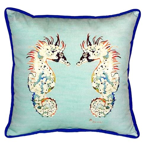 New Large indoor/outdoor pillows. Betsy's Sea Horses - Teal Large Indoor/Outdoor Pillow versatile pillows are equally at home enhancing an interior design or adding life to an outdoor setting. They feature printed outdoor, fade resistant fabric for years of wear and enjoyment. Indoor/Outdoor Use Artwork on one side.