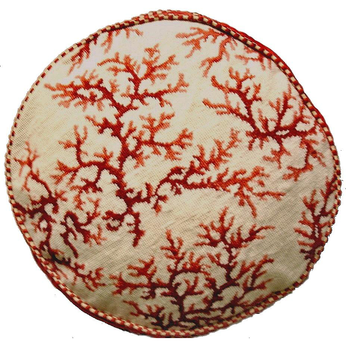 What a elegant Coral Round Pillow to adore your coastal home. This beautifully red coral and ivory background pillow is crafted in gross point and is hand stitched. The workmanship is superior and has to be seen to appreciate the quality. Accent your sofa, chair or bedroom with a outstanding work of art pillow. This tropical coral pillow is made with the finest vegetable dyed Australian and New Zealand wool threads.This handmade pillow features a cotton velvet backing and feather down insert and two color cording.