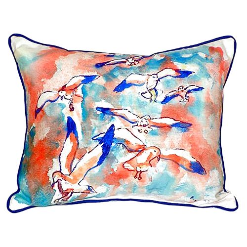 New Large indoor/outdoor pillows. Gulls Flocking Large Indoor/Outdoor Pillow versatile pillows are equally at home enhancing an interior design or adding life to an outdoor setting. They feature printed outdoor, fade resistant fabric for years of wear and enjoyment. Indoor/Outdoor Use Artwork on one side.