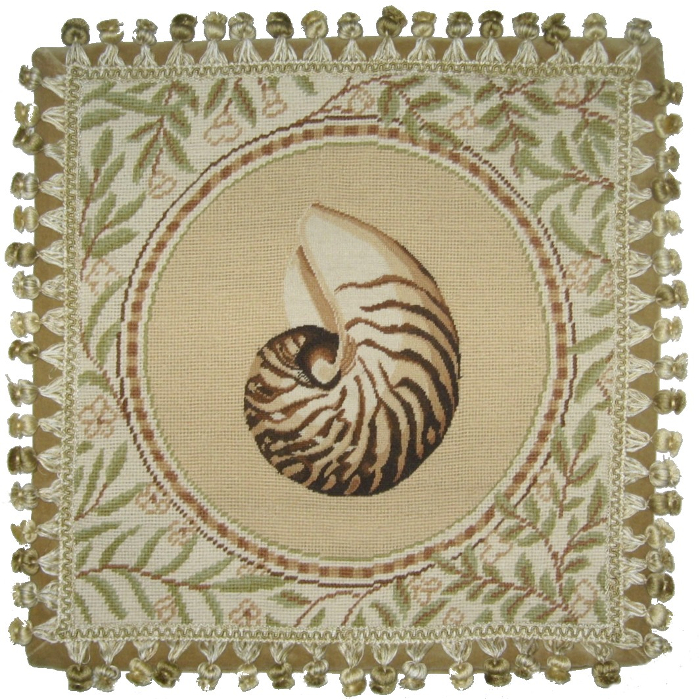 What a great coastal Tiger Shell pillow to enchant your coastal home. This wonderful sea shell pillow will accent your sofa, chair or bedroom with a outstanding work of art pillow. This finely detailed Tiger Shell Petit Point Pillow is made with the finest vegetable dyed Australian and New Zealand wool threads.This handmade pillow features a gross point back and feather down insert and is trimmed with tassels.