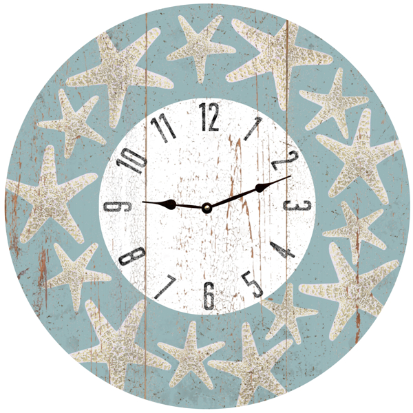 From San Diego California to Daytona Beach Florida "Starfish Clock"! Wooden Beach Clock features large easy to read numbers and a rustic 3 tone color scheme. White to represent the sand, aqua to represent the water and light blue for the sky.