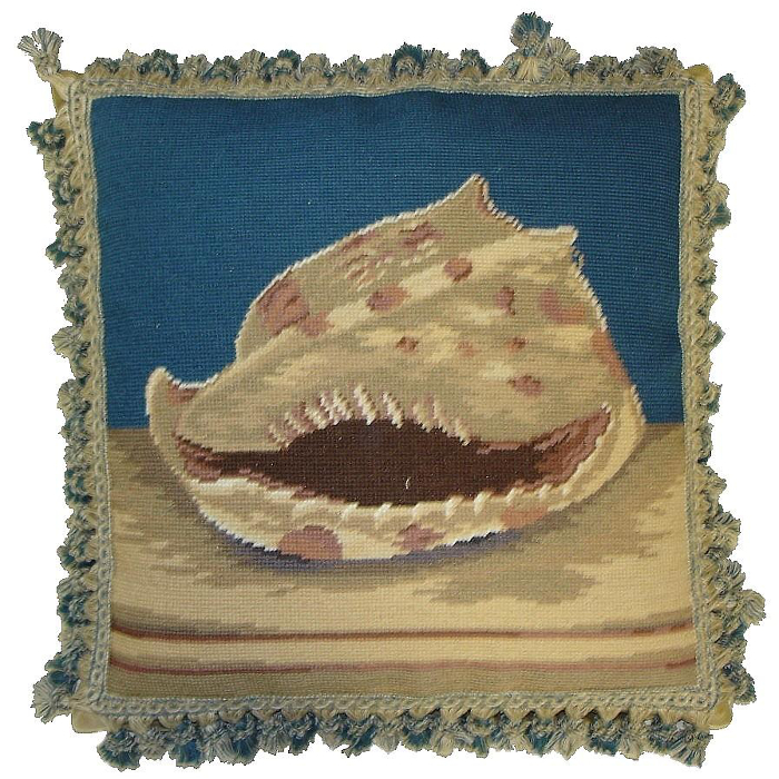 What a great coastal Spiral Shell Pillow to adore your coastal home. The spotlight is on this spiral shell! This is hand worked pillow with two color tassels. Accent your sofa, chair or bedroom with a outstanding work of art pillow. This shell pillow is made with the finest vegetable dyed Australian and New Zealand wool threads.This handmade pillow features a cotton velvet backing and feather down insert and is trimmed with two color tassels.