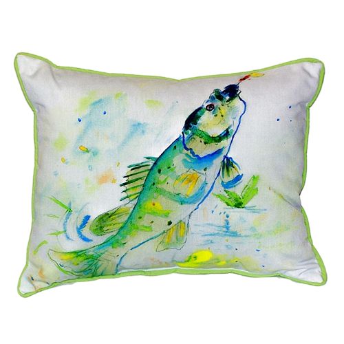 Yellow Perch Small Indoor/Outdoor Pillow versatile pillows are equally at home enhancing an interior design or adding life to an outdoor setting. They feature printed outdoor, fade resistant fabric for years of wear and enjoyment. Artwork on one side. Measure 12"x12" or 11"x14" depending on shape. Machine Washable Artwork on one side.