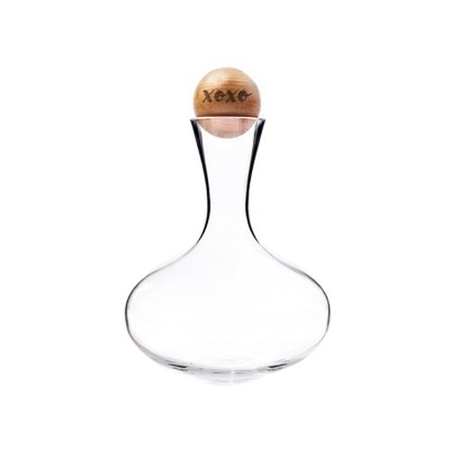 Filled with wine and poured with love, the XOXO Wine Decanter with Wood Stopper is ideal for any wine enthusiast. Featuring a curvaceous shape and "xoxo" engraved on the rubber wood stopper, it's the perfect addition to your Valentine's Day decor. Available as shown only. Dimensions: Decanter: 2.5" W (at smallest point) x 7.25" W. (at widest point) x 9.25" H.; holds up to 67 oz. Ball: 7.5" circumference. Features: A unique, curvaceously shaped glass decanter with a rubber wood stopper engraved with "xoxo". Materials: Rubber wood. Clear glass. Please Note: minor bubbles and swirls are inherent to hand-blown glass. Variations may occur on styles due to their handcrafted nature. Naturally occurring variations, including knots, notches and swirls in the wood grain, are inherent to the material, and the engraved personalization may vary with wood grain. The rustic finish is intended to enhance the warmth and character of these physical traits and contribute to their one-of-a-kind beauty. Care Instructions: Decanter: Dishwasher safe. Ball: Hand-wash only. Engraving Options: Available as shown only. See More Photos for additional views.